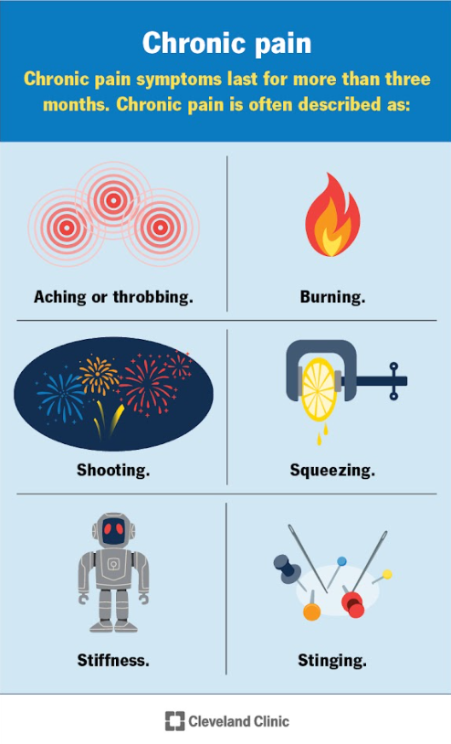 If you haven’t already read our blog about chronic pain, check that out here. This article from Cleveland Clinic breaks down chronic pain causes and the different types of experiences with chronic pain.
